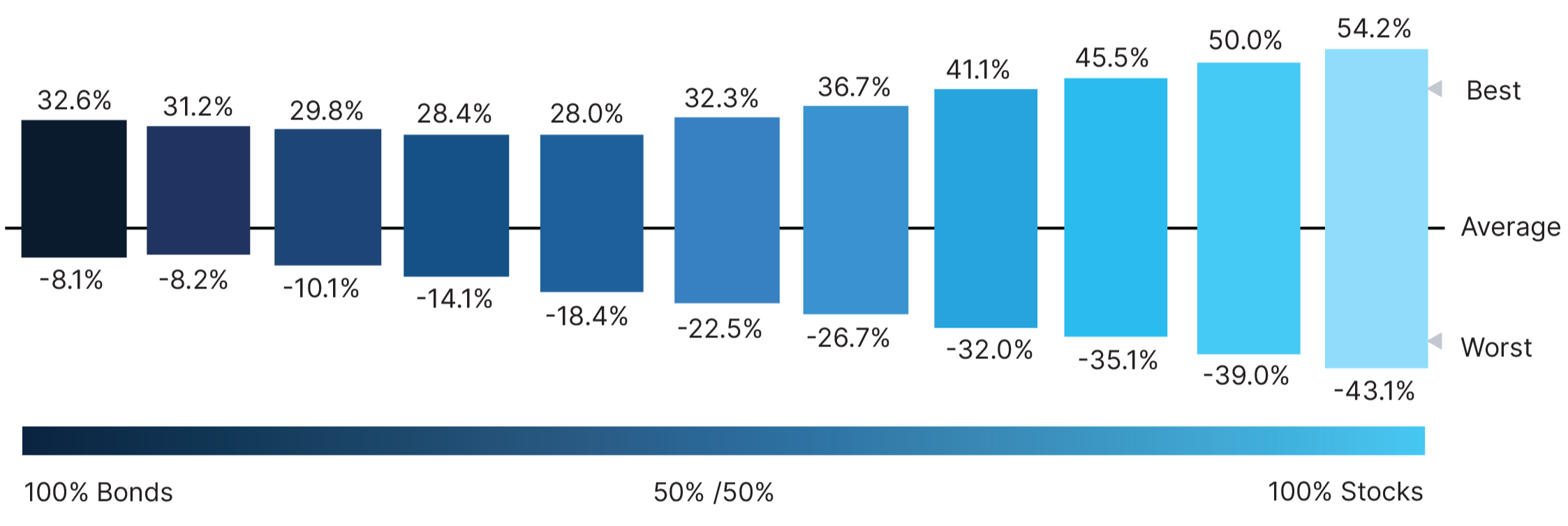 Best, worst, and average returns for various stock/bond allocations 1926-2018